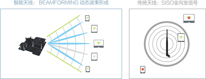 传统天线向各个方向无区别发射无线信号,能量在空中全向传播。